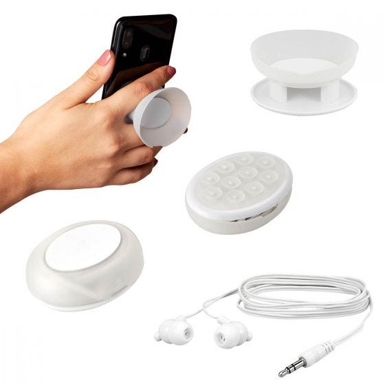Audífonos enrollables, base con ventosa para fácil sujeción. Función soporte para smartphone.