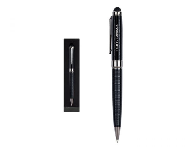 Bolígrafo con un refinado diseño en líneas horizontales de realce, punta de acero inoxidable, clip y anillo en color plata, con puntero para pantallas táctiles. Escriba con comodidad y elegancia. Mecanismo retráctil. Presentación: caja en color negro.