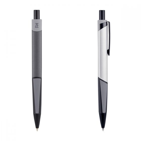 Bolígrafo cuerpo triangular y grip antiderrapante. Mecanismo pulsador. Incluye estuche.