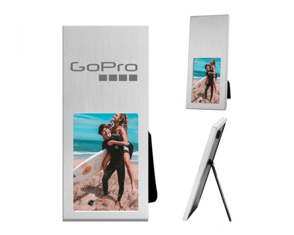 Portarretratos de aluminio de 14.8 x 6.4 cm con soporte plegable, para conservar esos momentos especiales. Presentación: caja en color blanco.
