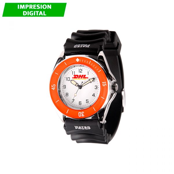 Reloj sport con correa de plástico y dial en bisel de colores. Incluye estuche metálico.