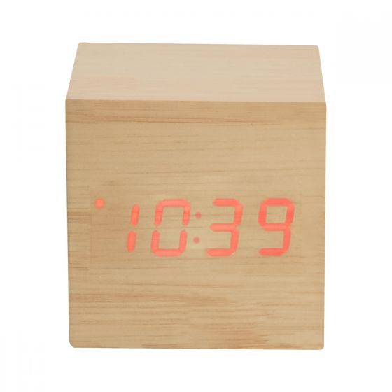 Reloj de madera con LED. Funciones: hora, alarma (se pueden programar 3 alarmas), calendario y temperatura. Baterías (3 pilas AAA) no incluidas. Incluye caja individual.