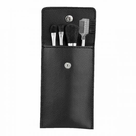 Set con 1 aplicador de sombras, 1 peine para cejas y pestañas, 1 pincel para sombras y 1 brocha para rubor o polvo.