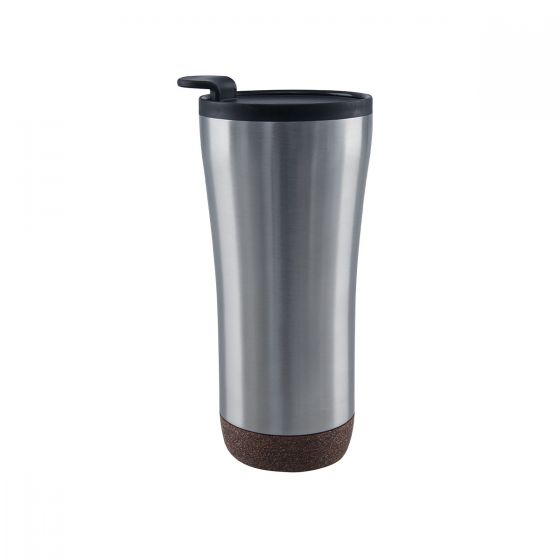 Doble pared. Pared interior plástico, pared exterior acero inoxidable. Base de corcho. Tapa en dos posiciones. No usar en microondas ni lavavajillas.