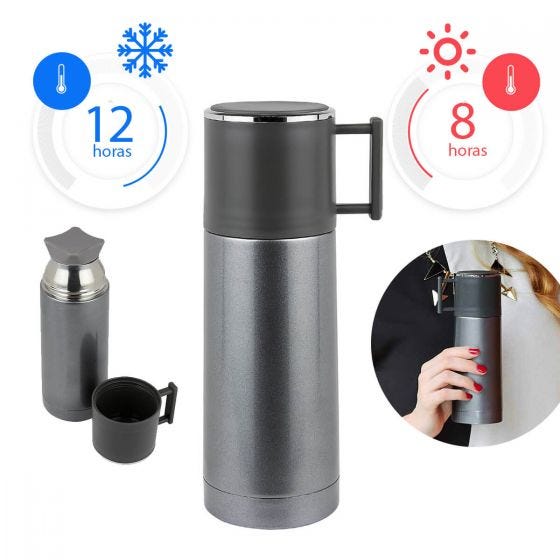 Doble pared. Cerrado al vacío. Pared interna y externa acero inoxidable. Incluye taza y válvula de seguridad.